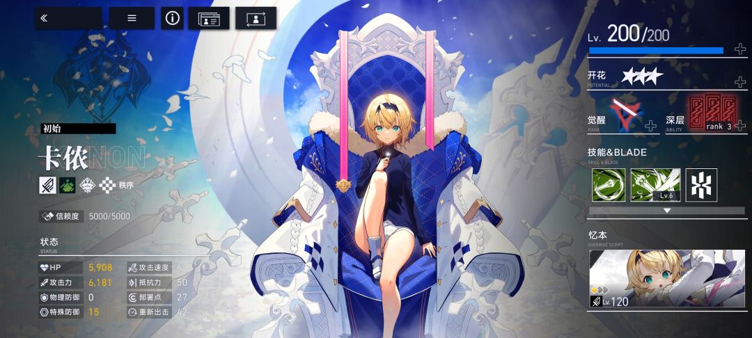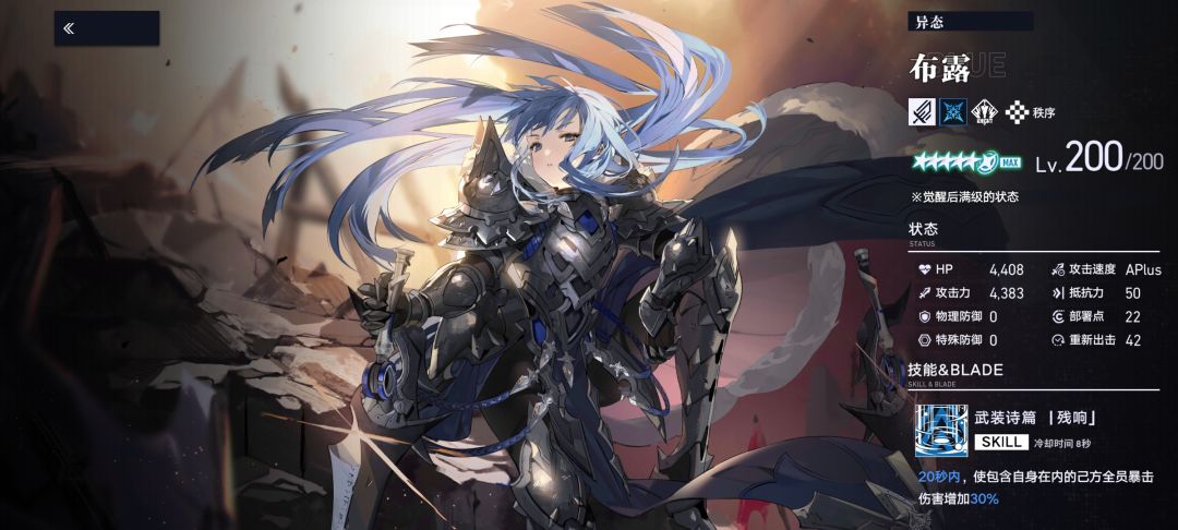 蓝神:布露(异态),冲击属性主攻手,自身伤害高,并能够为队友增加暴击伤害。
