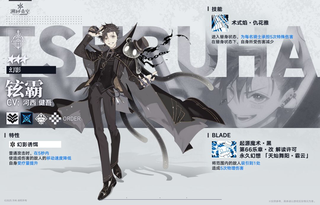 铉霸(幻影):冲击属性奇术师,普攻是短暂生成一个不会移动的小黑洞,减速敌人。其他信息可以直接看官方给的图: