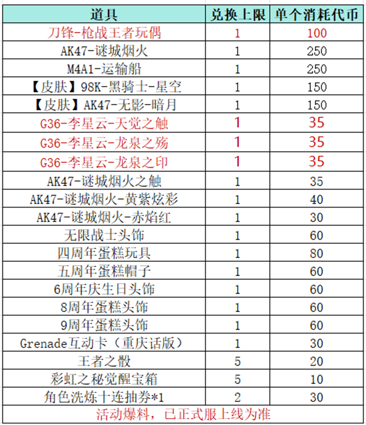 看完奖池奖励,接下来是商城兑换奖励。其中不仅返场了往年的纪念武器以及各种纪念道具,而且还上架了G36-李星云的专属武器万化道具,包含G36-李星云-天觉之触、G36-李星云-龙泉之殇、G36-李星云-龙泉之印。喜欢的小伙伴可以顺手拿下,全部装备后还能提升枪械手感,让你枪枪爆头不在话下。