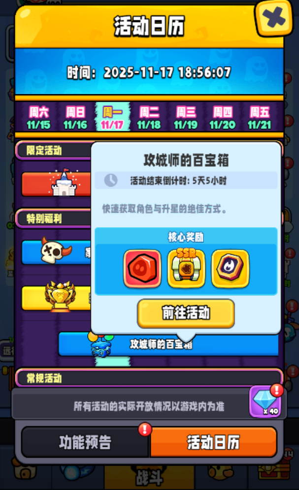 2、点击某个活动时可查看核心奖励和前往活动界面;