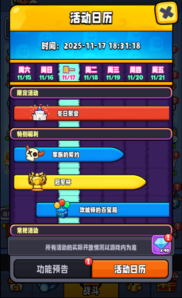 1、“功能预告”中新增活动日历界面,打开即可查看周期内活动开启详细情况;