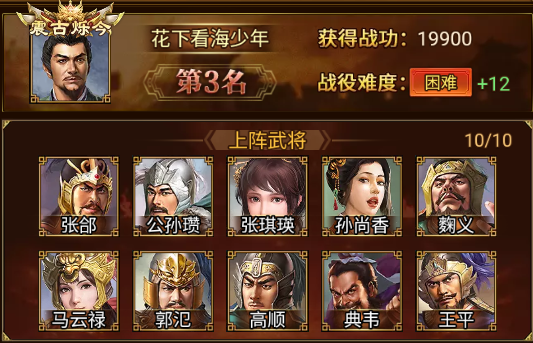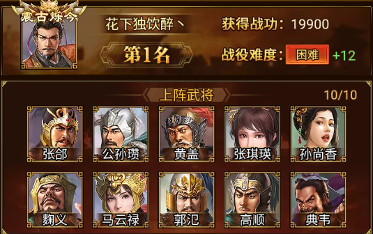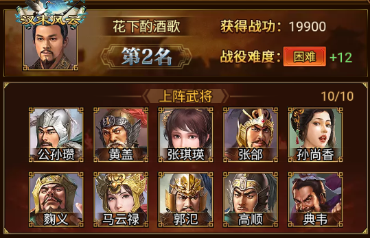位居第二的是 花下酌酒歌 军团,同样以 19900 的优秀战功,成功攻破 困难+12!