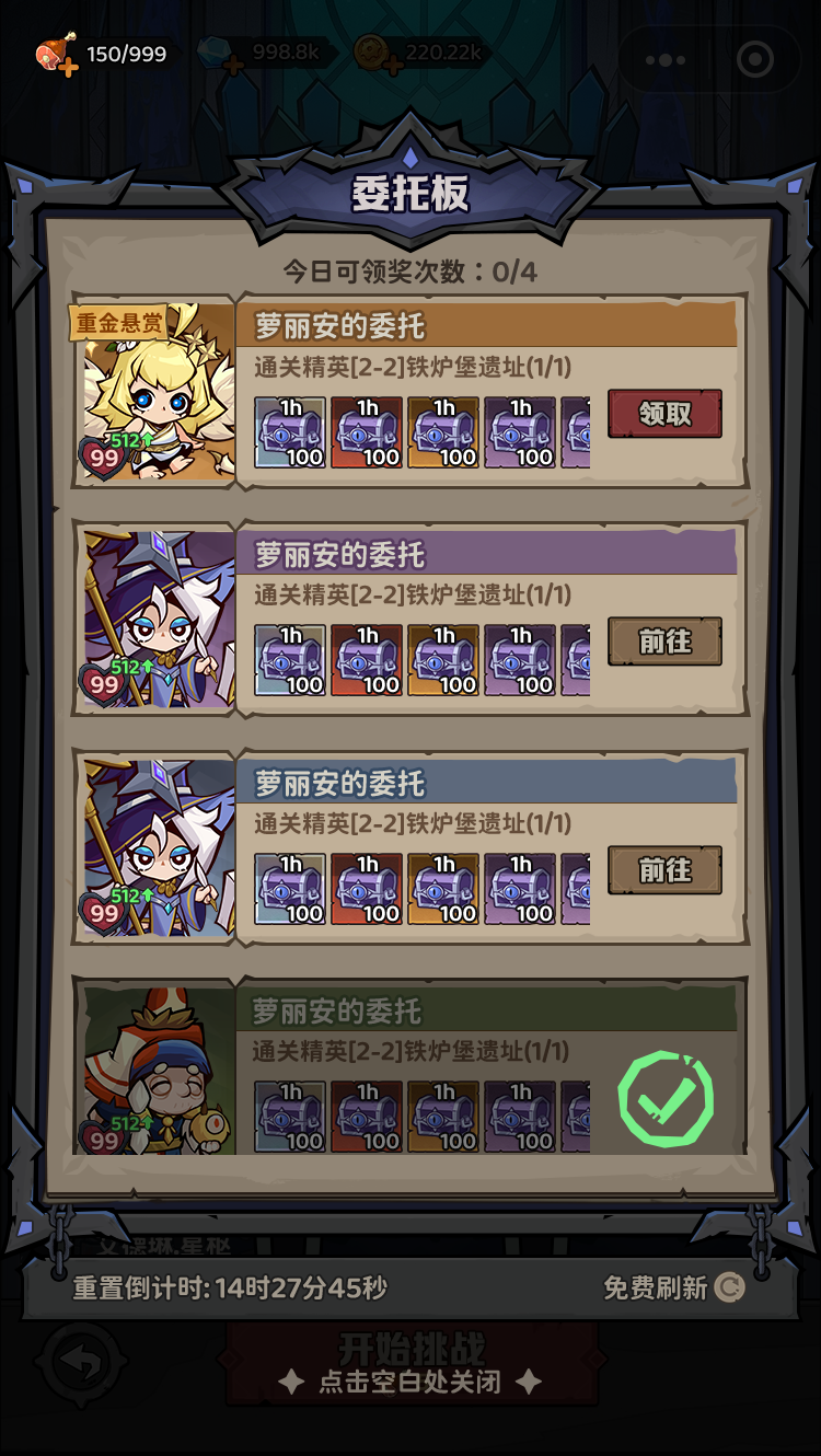 - 每日0点刷新“今日可完成次数”,共有4次免费机会。用完可使用【委托书】继续完成更多委托。