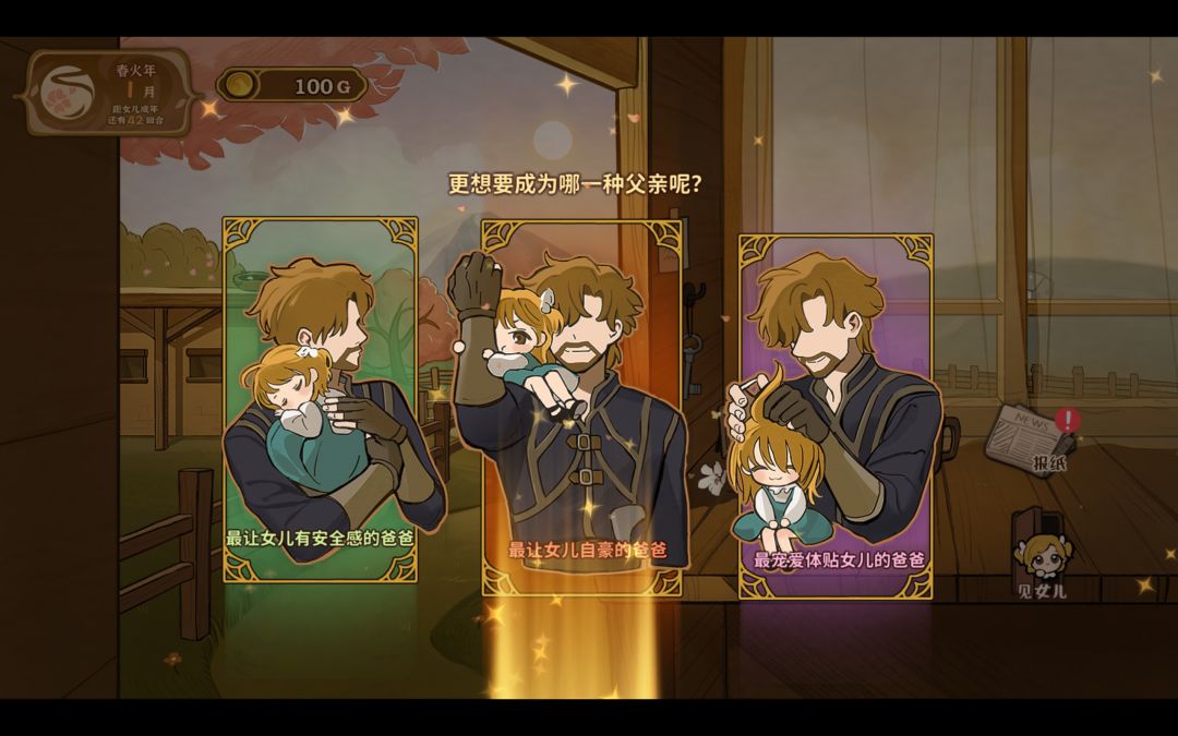 春火年1月开始时,游戏会让爸爸选择希望要成为哪一种父亲,并提供了3种选项: