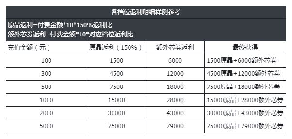 Ⅰ.按阿Sir账号累计真实充值金额,多角色多次返利(包括删除角色)共同累计,按比例返利芯券+等额原晶。