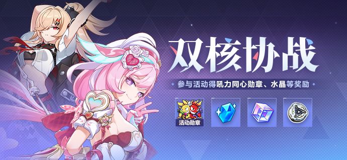 「双核协战」活动开启,舰长需要选择两名出战角色以及一名支援角色参与关卡战斗。活动期间,舰长通过累积特定积分或完成限时任务可获取吼力同心勋章、水晶、根源棱镜、爱因斯坦环磁机等奖励。