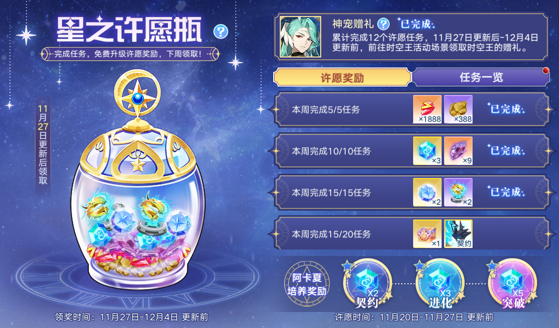 2.累计完成5/10/15/20个任务,可向星之许愿瓶依次叠加许愿奖励,领奖时间内可领取: