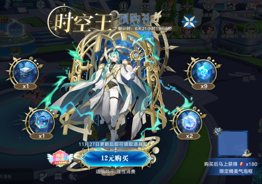 1.在预购时间内购买12元预购礼将立即获得:星币*180、时空王限定精美聊天气泡;