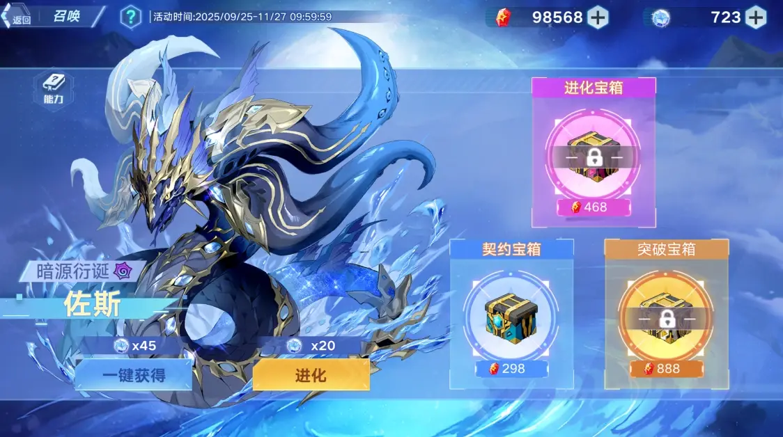 1.在召唤佐斯活动中,消耗对应数量奥拉辉石可将佐斯进行契约、进化和突破: