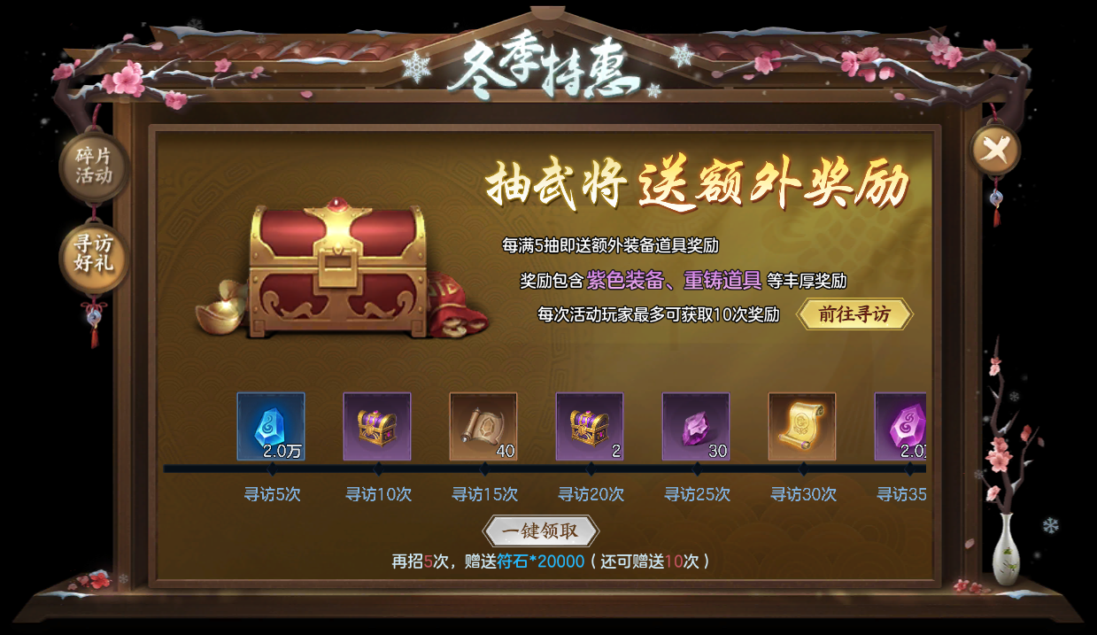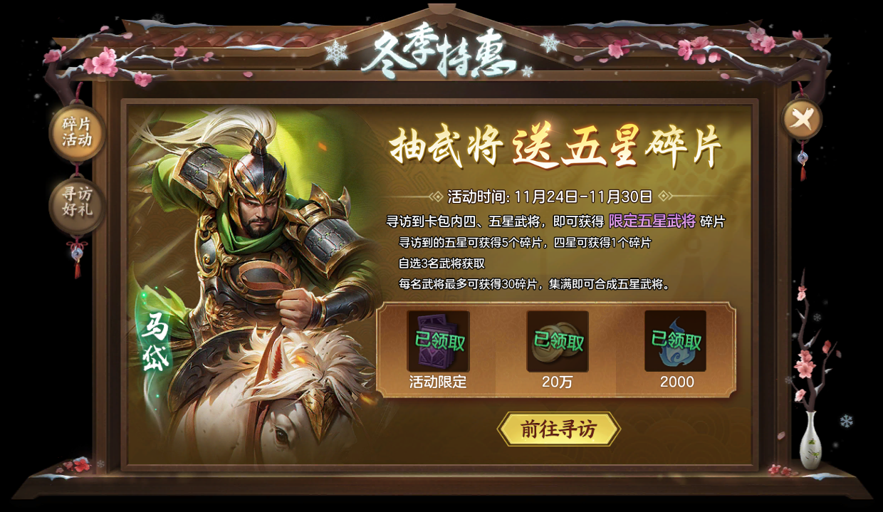 活动期间,玩家在活动限定卡包内招募到四、五星武将即可获赠武将碎片。招募到四星武将可获得1个自选五星碎片,招募到五星武将可获得5个自选五星碎片。