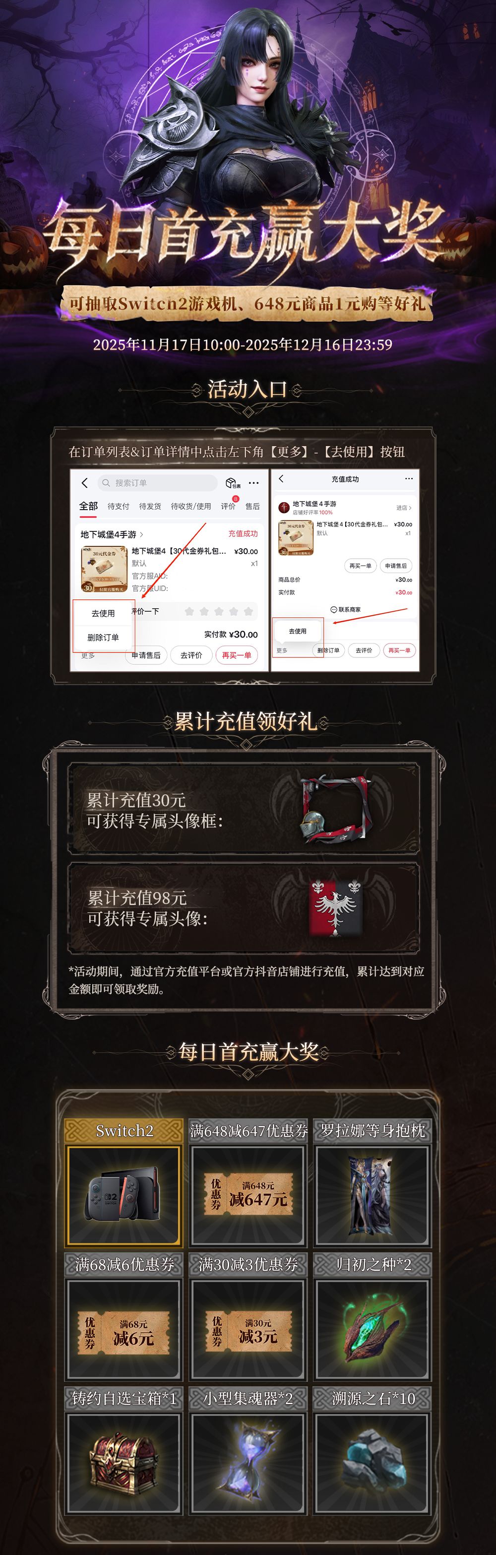 本期活动中,堡主们在直播间充值不仅能享受笔笔代金券加赠,每日任意充值还能抽满减券、switch2等好礼,累充更有专属头像、头像框福利!堡主们购买完成后,可以在订单列表&订单详情点击左下角【更多】-【去使用】按钮参与~