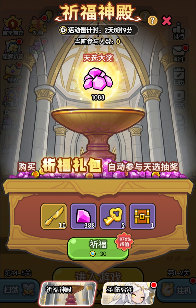 (1)祈福神殿再次开启,活动期间购买“祈福礼包”,即可获得十倍超值道具,且会自动参与1088钻石的“天选大奖”的抽奖;