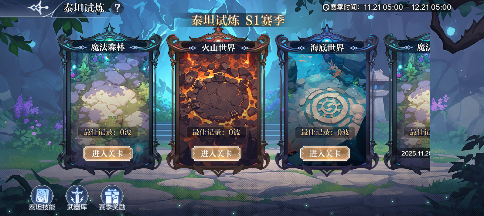 2、每个赛季设有多个平行关卡,统计本赛季中每个关卡的最高波数,所有关卡累积最高波数达标后,即可领取赛季奖励:泰坦残骸(源起技强化材料)和泰坦技能卷;最快1天拿满当周上线精灵源起技养成所需泰坦残骸。
