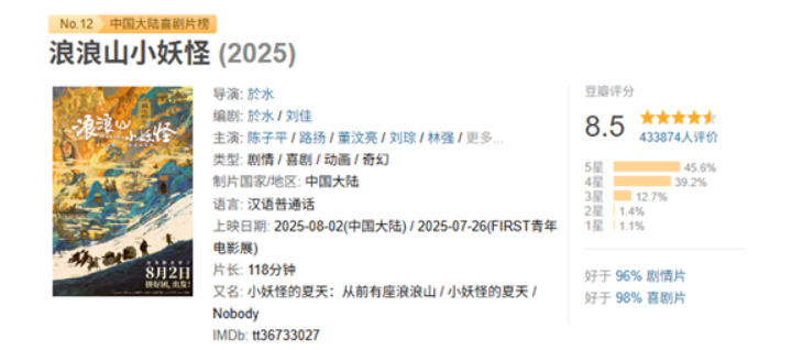 作为中国影史国产二维动画电影票房冠军,该片累计票房已突破10.47亿元,口碑更是居高不下 —— 豆瓣评分稳定在8.5分,超43万用户参与评分,位列今年国产动画长篇电影评分第二。其成功秘诀在于独特的叙事视角,跳出《西游记》宏大主线,将镜头对准以往沦为背景板的小妖怪们。