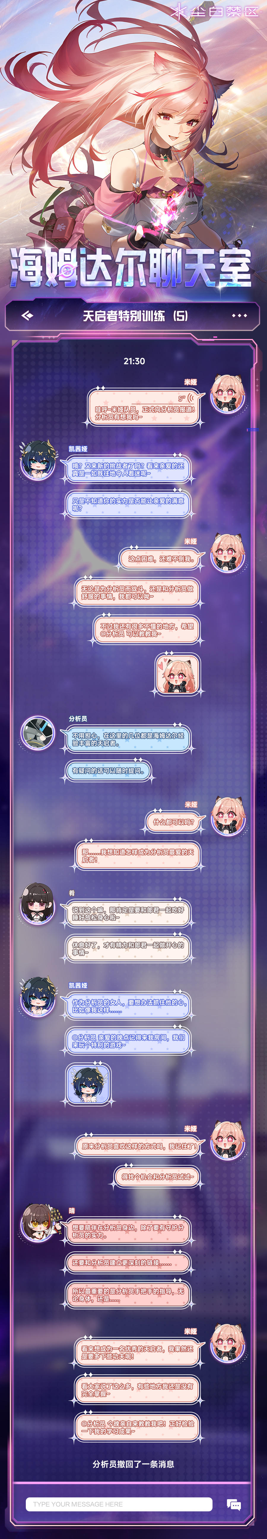 成为一位优秀的天启者到底需要些什么呢?对于刚刚加入海姆达尔的米娅来说,这是一个困扰着她的难题。为了能和分析员更加亲密地相处,她决定向其他队员寻求建议……