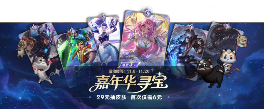 嘉年华寻宝活动倒计时3天!29元就能抽取精美皮肤,首次仅需6元即可体验一发入魂的爽感!召唤师们不要错过啦~