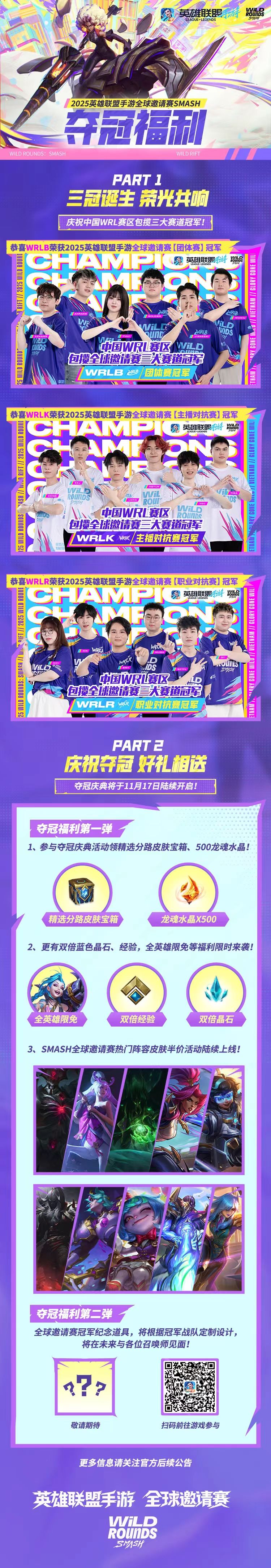 荣光共响!《英雄联盟手游》全球邀请赛SMASH已圆满落幕!中国WRL赛区包揽全球邀请赛所有赛道冠军!召唤师们快来一起共享冠军荣誉吧~