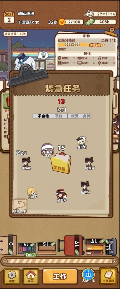 ✅ 存档功能上线:终于不用怕中途退出丢进度!随时存档、放心畅玩,你的职场人生由你掌控~✅ 表现值机制:开除不再 “随机触发”!新增表现值设定,工作表现直接挂钩去留,努力就有回报,职场更公平~