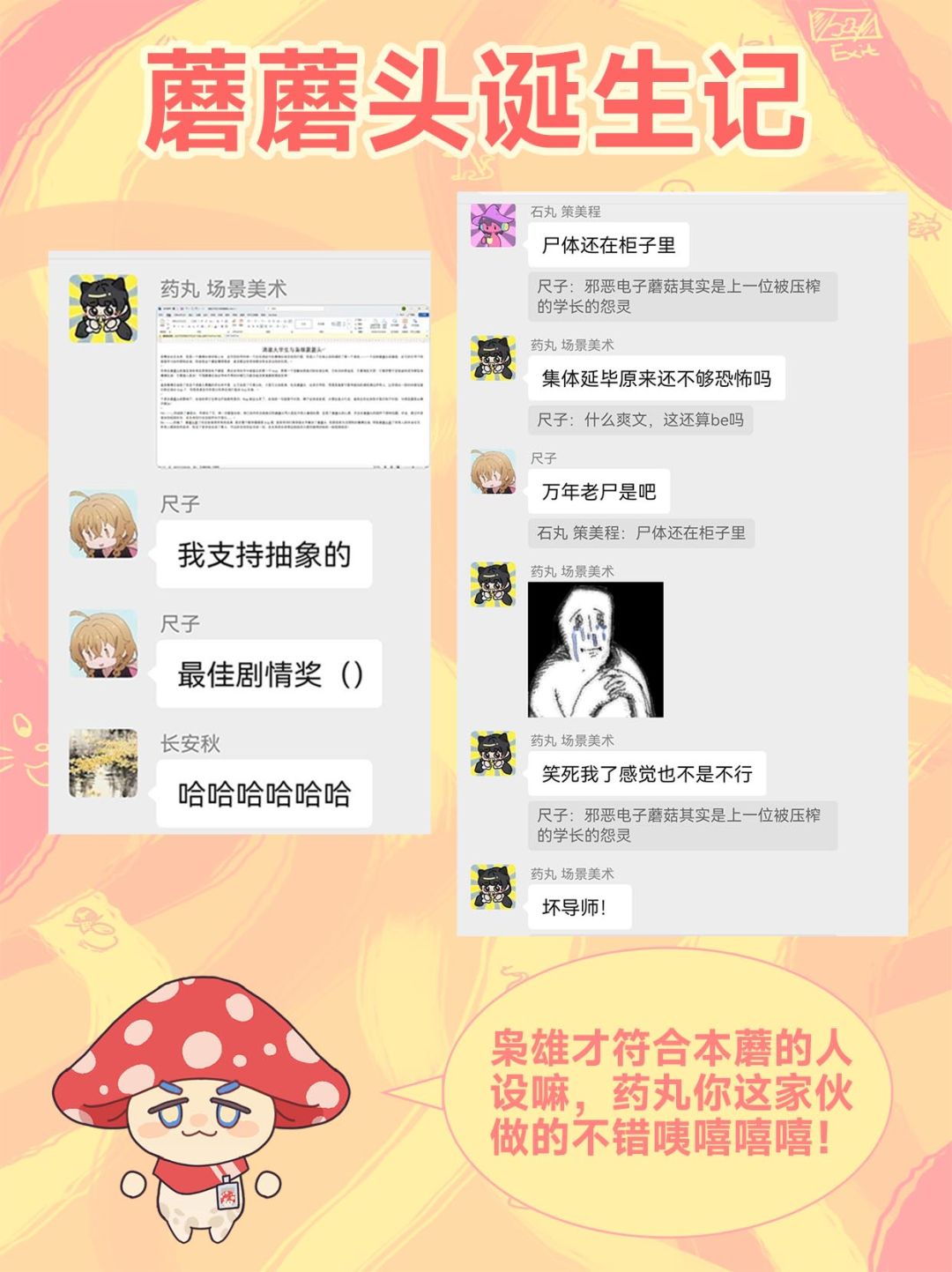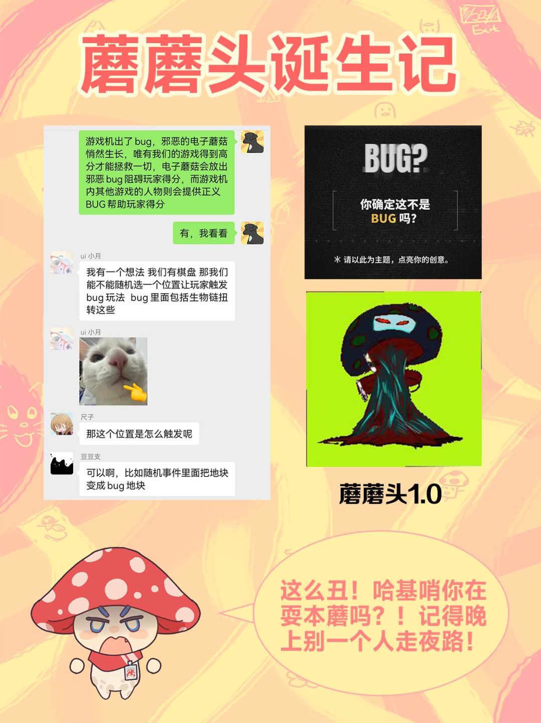 Last but not least!!!我们的药丸老师出手了,当时在开着会议一起讨论玩法,药丸老师默不作声的甩出一张简简单单的WPS截图,短暂的沉寂过后是连绵不绝的欢笑,大家在会议里都忍不住了,气氛从卡住的沉默到笑到发狂,而且这个故事也成为了蘑蘑头的前身,可以说药丸的这个故事才让蘑蘑头得以出生![[心动小镇_点赞]](https://img-tc.tapimg.com/market/images/17a929b2fb36da6ca1d925a7d08acef9.png)