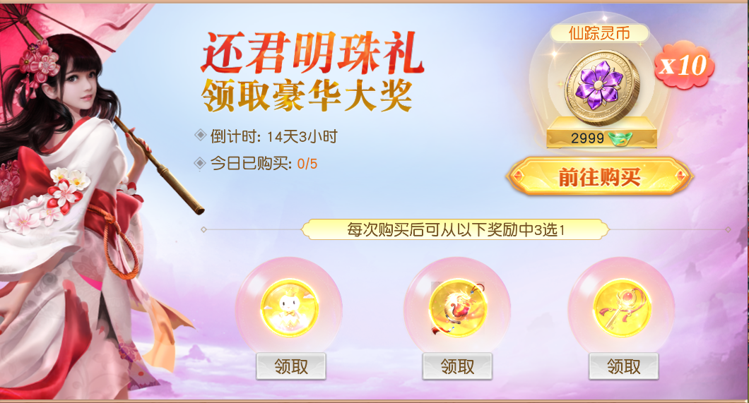 活动介绍:活动期间每天可使用元宝购买仙踪灵币,每次购买后均可在以下3种奖励中任选1种奖励。