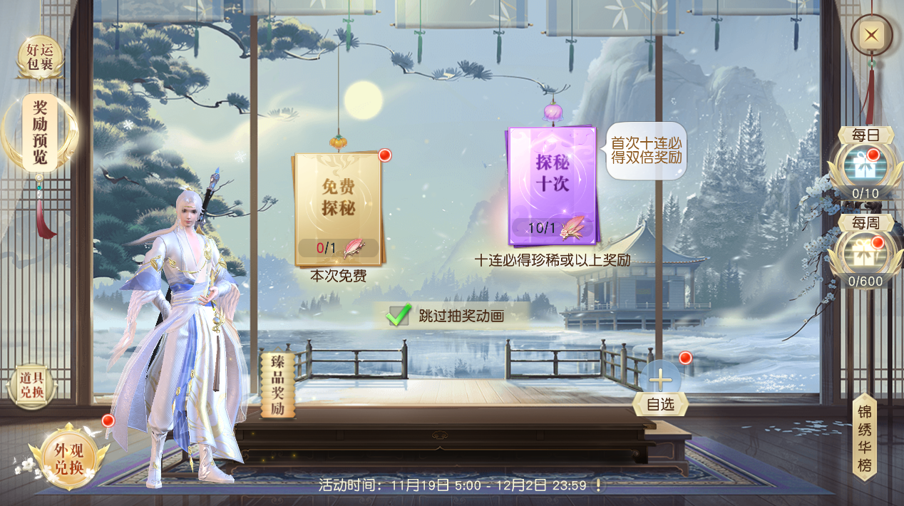 每间隔48小时可进行1次免费探秘,每10次探秘必得高级及以上奖励,每70次探秘必得珍稀及以上奖励,每200次探秘必得臻品奖励。活动开启后首次十连(或单抽十次)可触发双倍奖励。此后每次十连都有10%概率触发双倍奖励,每100次探秘必定触发1次双倍奖励。触发后累计次数重置。