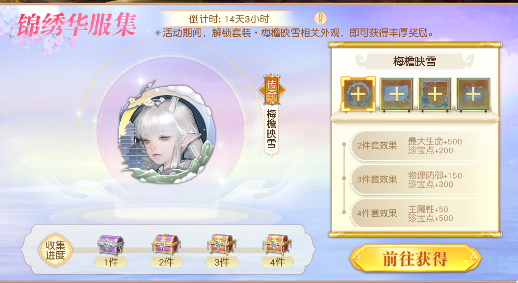 1.活动期间解锁梅檐映雪套装相关外观,即可获得丰厚奖励。