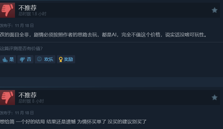 截止目前游戏Steam平台评价为褒贬不一,仍有大量网友对这部改编作品持有不认可的态度