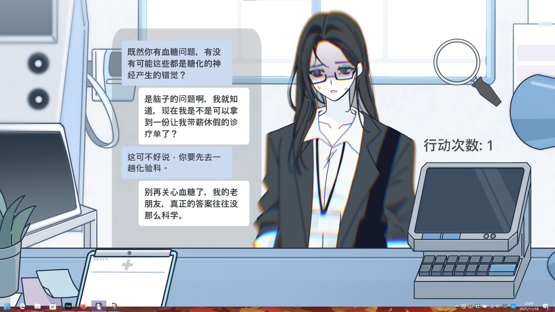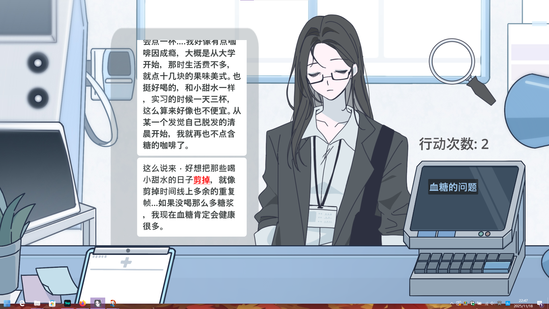 这一段对话中,选择“剪掉”可回到前述流程,点击旁边机器上出现的“血糖的问题”会进入后续对话: