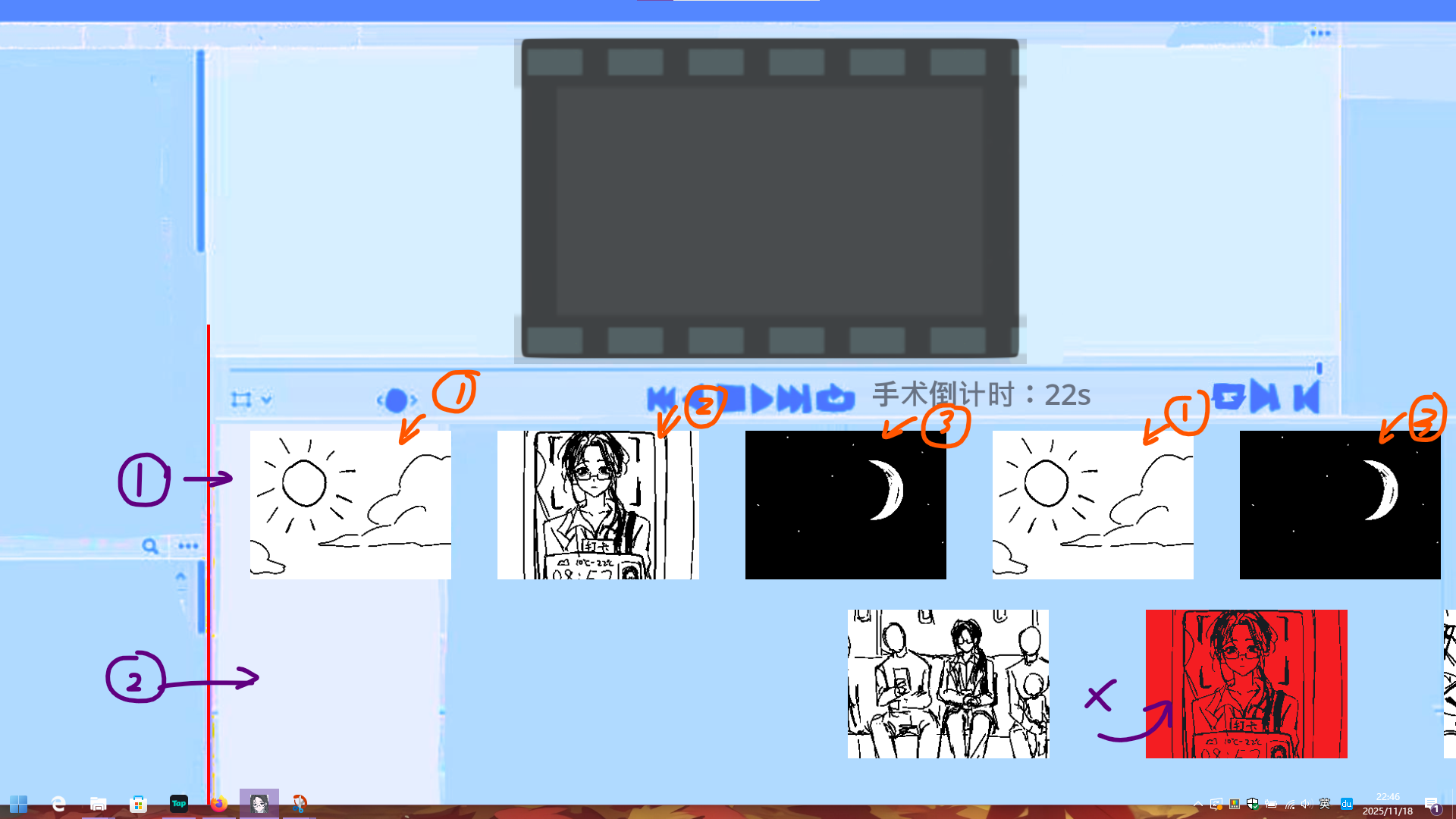 进入双轨道治疗,需要同时完成如下动作:在轨道1将画面按白天-打卡-夜间(如图中橙色标记序号所示)排列;在轨道2将红色画面消除(点击即可)。