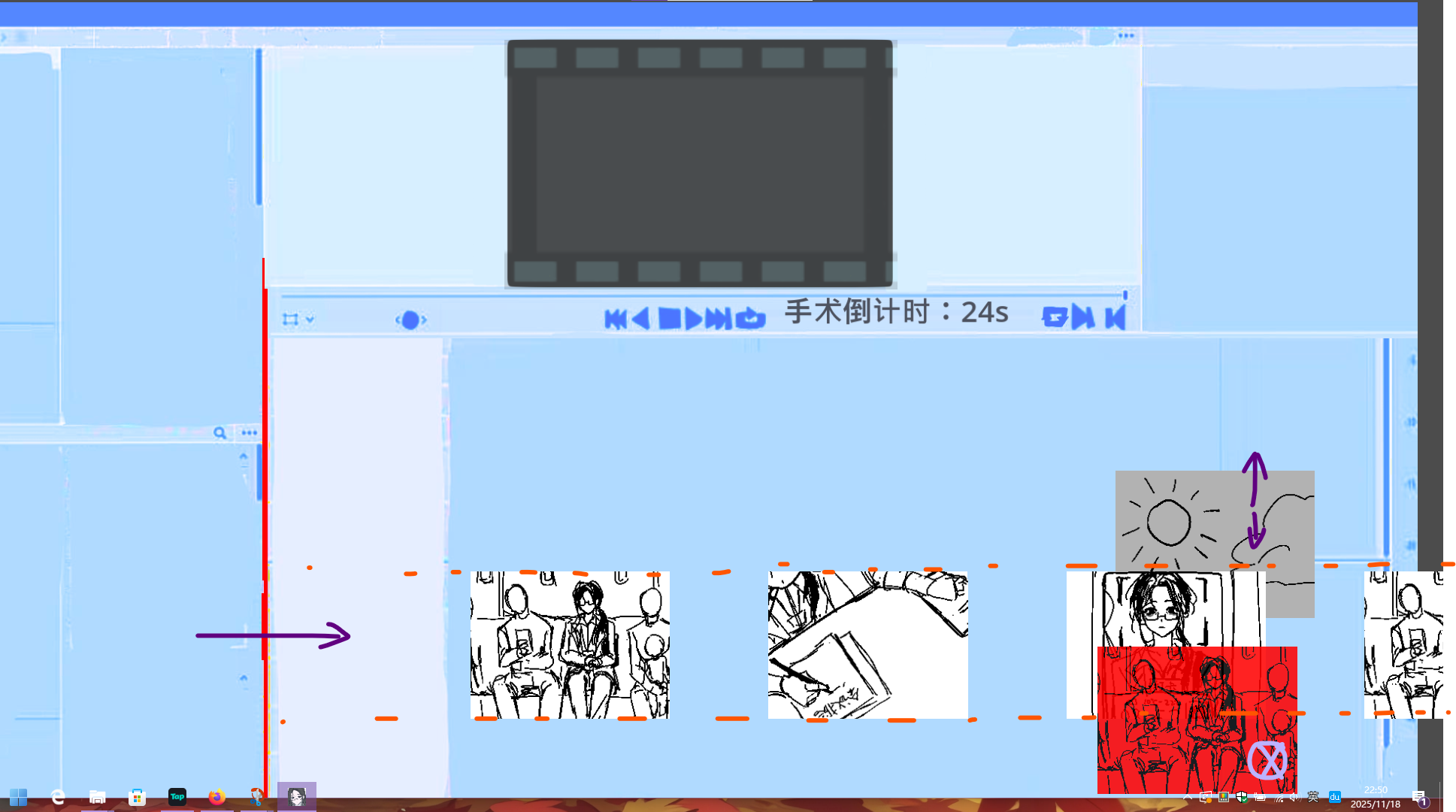 之后,进入四轨道治疗,需要完成如下动作:只留下如图所指向的那一行的画面,消除不在这一轨道的所有画面(非红色画面上下拖拽即可消除,红色画面点击一下即可消除)