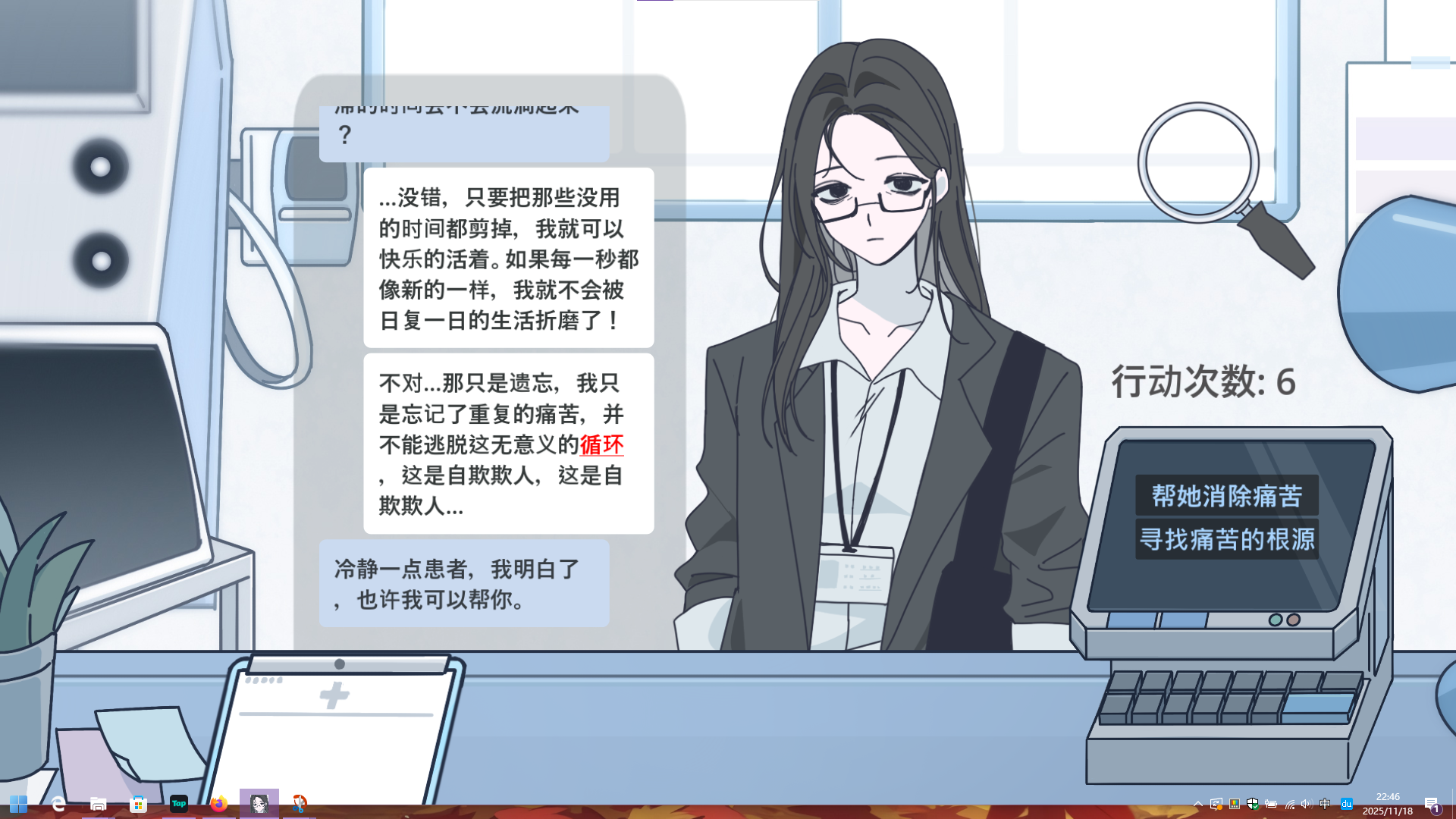 第六段对话,结束后右侧显示屏上出现两个选项:“帮她消除痛苦”和“寻找痛苦的根源”: