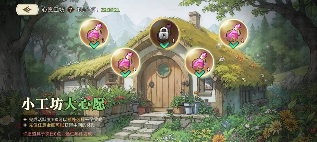 活动期间,每天拥有最多5个心愿,通过登录游戏、达成100活跃度可获得许愿次数;当天任意充值还可以获得专属心愿奖励!