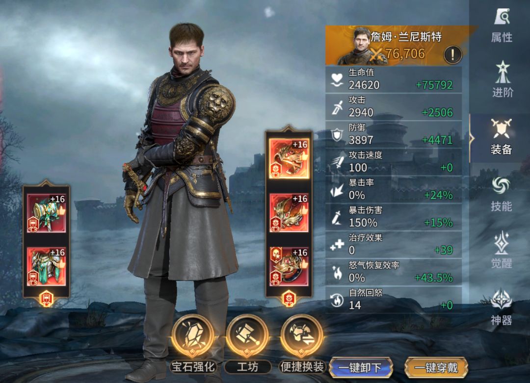 天赋:可给攻击范围内2名攻击最高的友方附加10%减伤,有用、意义不大,真缺减伤还是要带减伤奶(物理&魔法减伤可与范围、最终减伤、所有伤害降低等效果叠加)。天赋可给友方添加凯岩城之荫,友方受伤时詹姆有额外回怒,在深渊龙、泰坦这类BOSS场合能多频触发。
