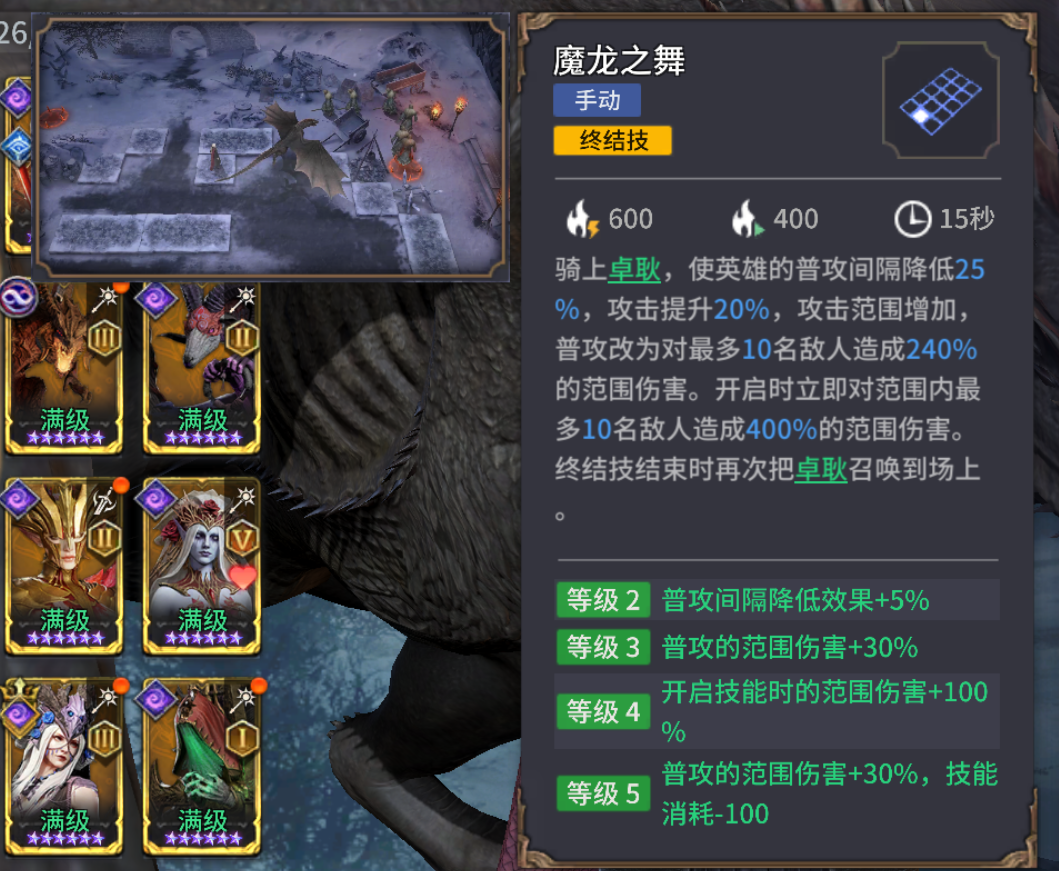 魔龙之舞(终结技):丹妮莉丝基础数值较高,再加上攻击间隔降低、攻击增益,终结技开启后15秒内,可持续通过普攻打出高额群体伤害。这个终结技最大的特点是仅600怒气消耗,可以更高频的释放大招、连续清杂。