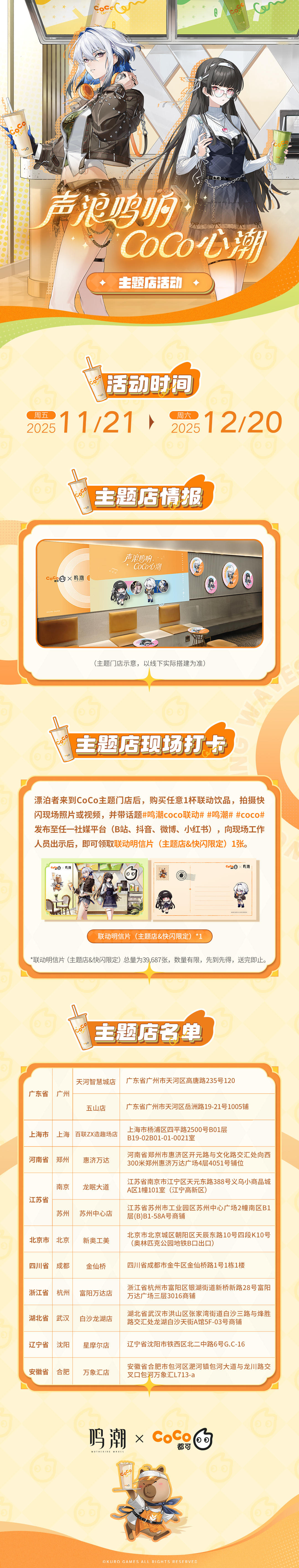 「声浪鸣响,CoCo心潮」鸣潮 × CoCo都可官方 联动活动将于11月21日正式开启,联动套餐及主题门店即将上线。