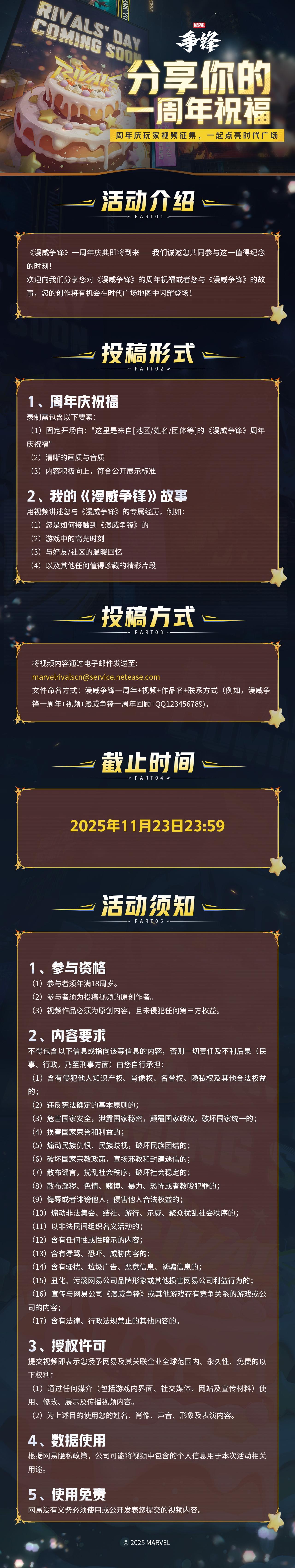 欢迎向我们分享您对《漫威争锋》的周年祝福或者您与《漫威争锋》的故事,您的创作将有机会在时代广场地图中闪耀登场!