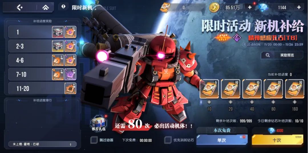 活动期间,指挥官可通过【机体战令】或【新机出击】抽卡池获取新机「精神感应扎古[TB]」,作为SP类型火力机体,它擅长用多段攻击对敌人造成大量伤害。