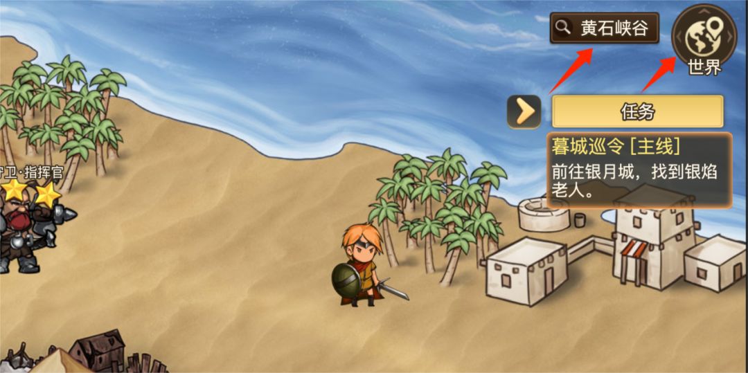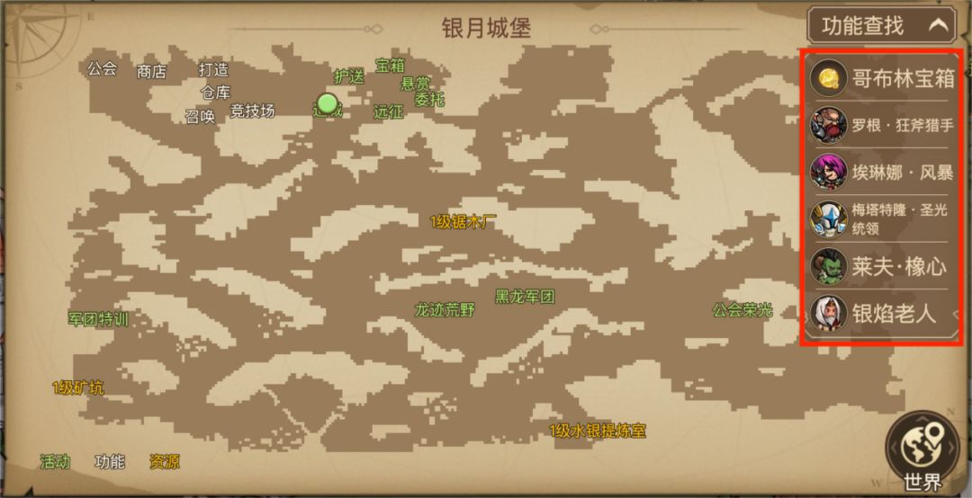 3、下图箭头是可以点的,打开小地图,可进行功能查找(带星星奖励的主线、宝箱等),有些没打到三星的主线任务也可以从这里找回去打,哥布林宝箱是一次性的奖励。