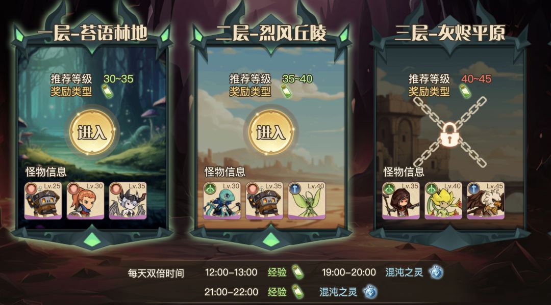 「魔法秘境」打之前把各项属性加一下(英雄战位等级、天赋点;英雄战术训练点、装备穿没穿、英雄升星)。第一天可以打10关,超多经验,而且没什么难度,可自动。(以后打15-25关要看一下,难度提升)