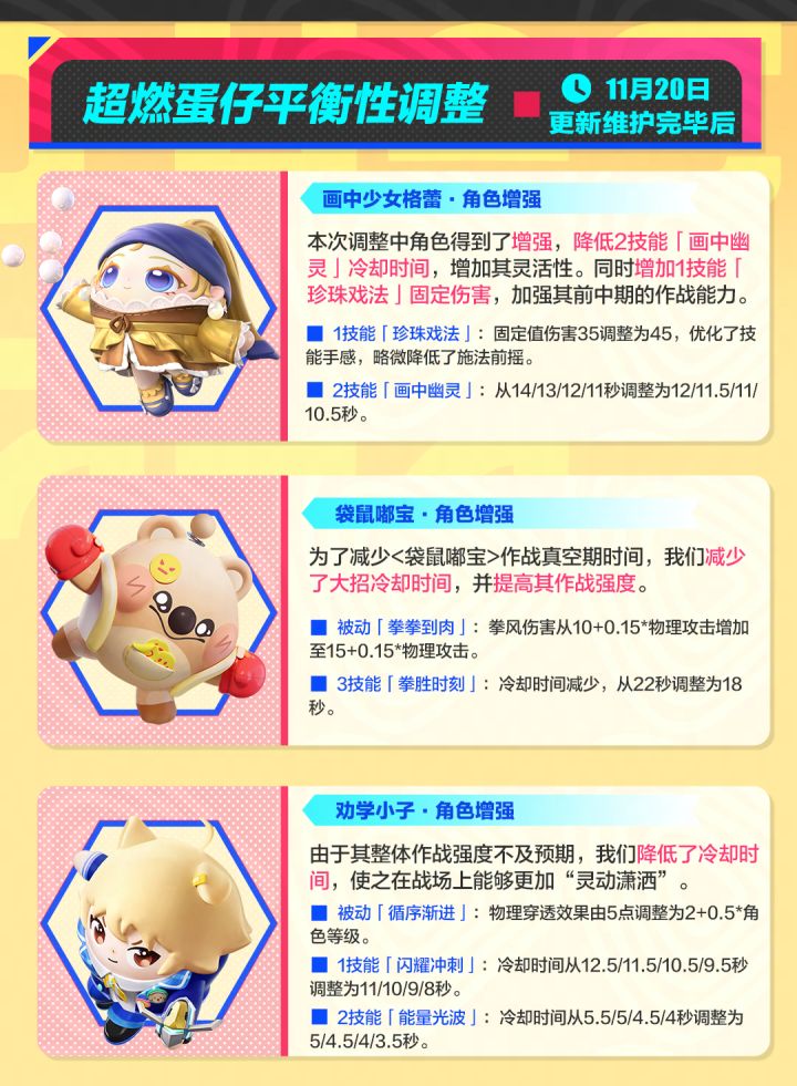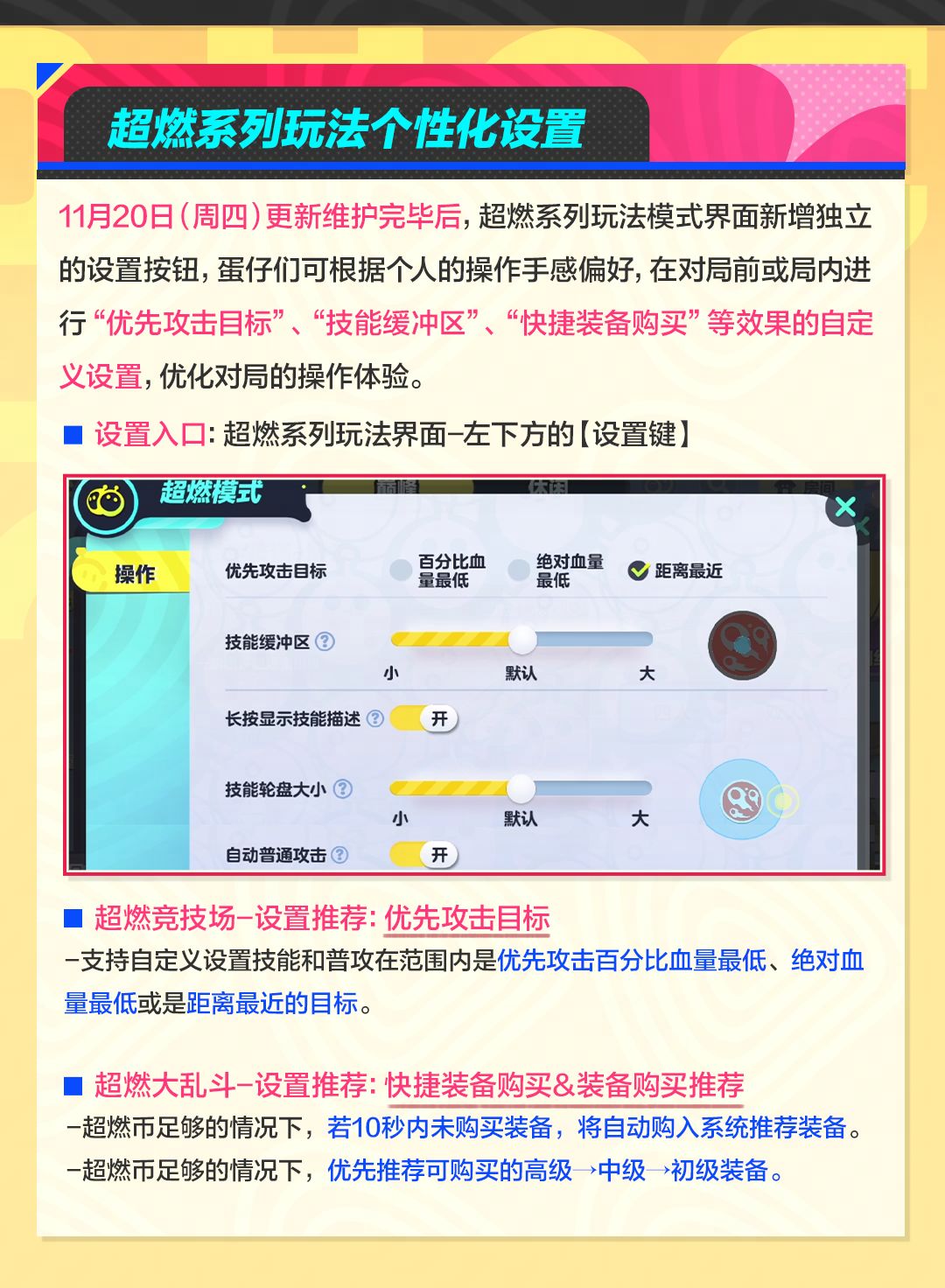 11月20日(周四)更新维护完毕后,部分超燃蛋仔迎来强度调整和优化。此外,新增超燃系列玩法专属设置按键,蛋仔们可根据个人操作偏好进行设置!