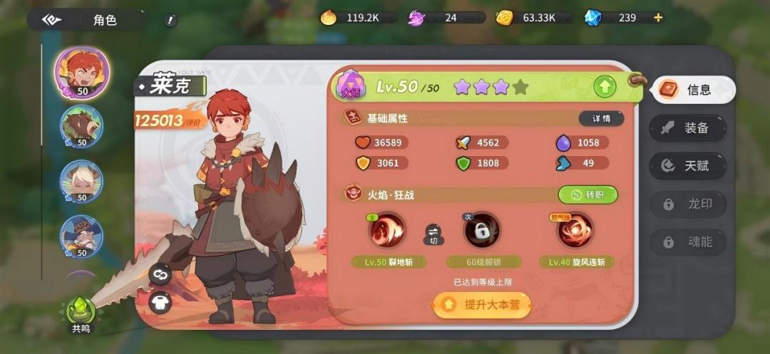 除此之外,莱克在培养到一定阶级后可以转职,分别是偏向群体保护的护卫,以及偏嘲讽和可以进入无敌状态的逆甲。在游戏的前期,我们还接触不到转职的选项,因此可以优先培养狂战的技能。