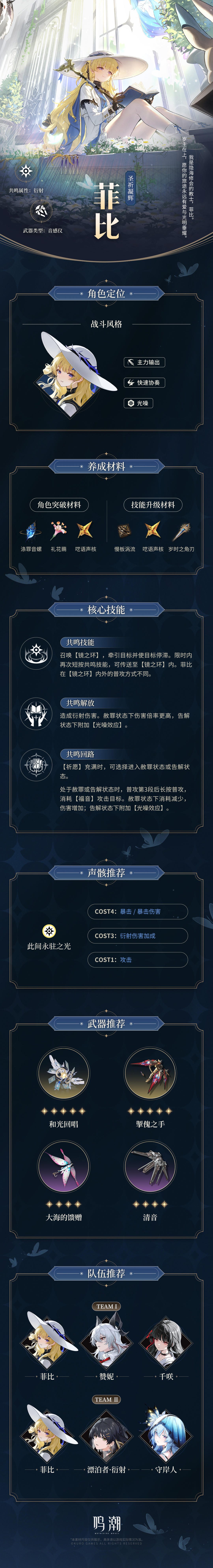 隐海修会的教士菲比,友善而虔诚的圣职者少女,以纯粹之心修习,认真践行着身为教士的一切职责。她的祈祷恰如她手中的光芒,柔和明亮,为人们带来温暖与安宁。
