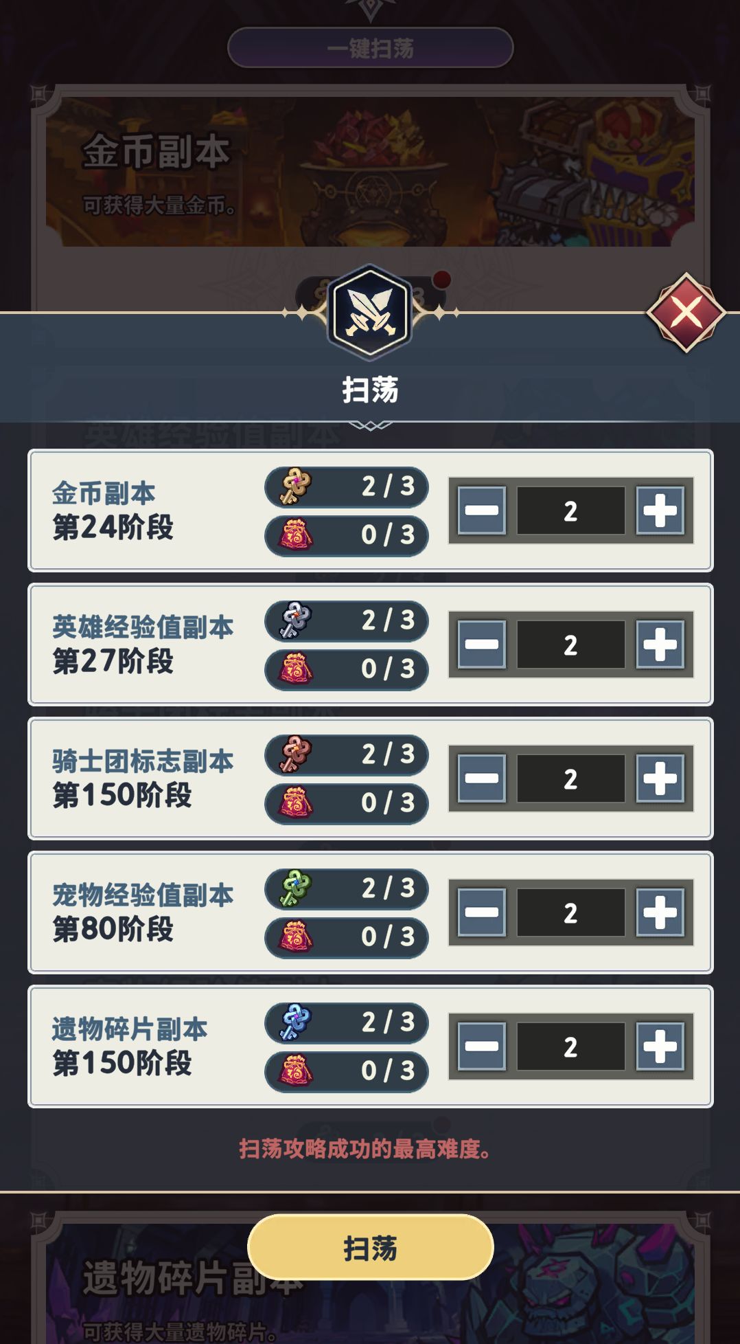 1.每日副本界面新增【一键扫荡】功能,可针对当前已完成挑战的所有副本最高等级关卡进行一键扫荡,月卡获得的额外每日副本次数优化为可以批量获得;