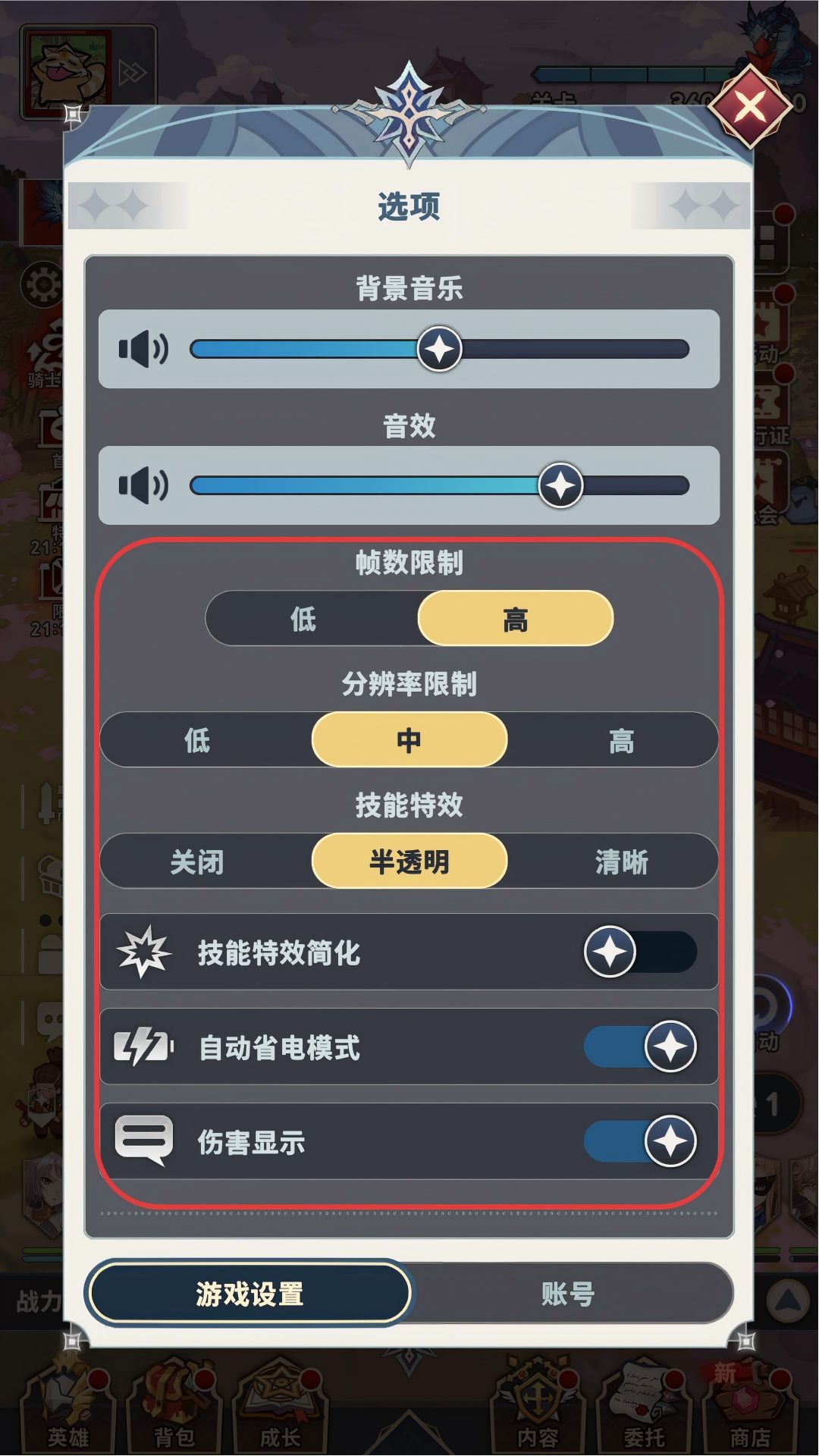 - 如果您是低配置设备,可以通过调低游戏帧率、关闭技能特效、伤害字体等方式减轻设备负载压力,缓解卡顿发热问题;