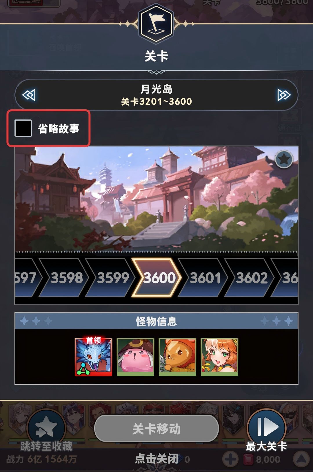 ▶游戏前期大家就可以点击主界面的关卡,除了关卡移动的功能外,不要忽略跳过剧情功能哦——只要勾选【省略故事】,即可跳过剧情对话,进行沉浸式的关卡推进。