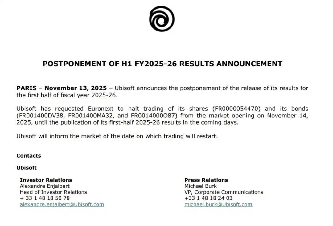 巴黎 – 2025年11月13日 – 育碧(Ubisoft)宣布推迟发布2025-26财年上半年的业绩结果。