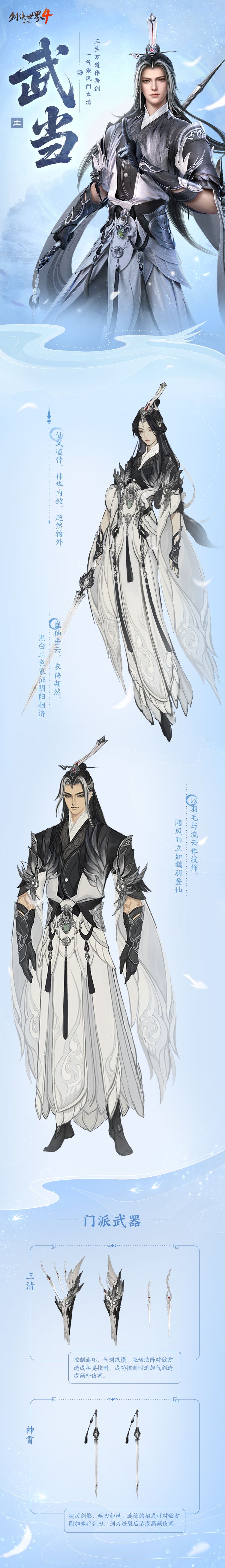 绝峰霜飞雪,孤鹤层云决。土系门派「武当」以剑立派,门派弟子御剑凌空、卦定乾坤,其仙风道骨、从容睿智的风范让这个门派充满了世外高人般的神秘色彩。