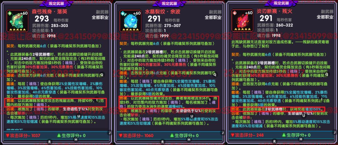 除了图中用红色框框圈住的部分外(即燃魂,是武器装备在二号位时的主动技能),其他部分内容都是一致的,如果只考虑加成,携带任意俩把魂契限定享受到的加成都是一样的,接下来将分为总加成,主动技能,充能三部分进行介绍。