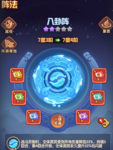 - 作用:包含5个独立阵法,每个阵法均可提供基础属性加成与独特团队技能(如增伤、减防、提速等),升级后显著增强队伍综合战力。
