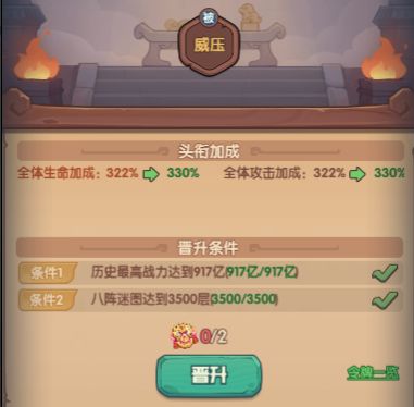 - 作用:通过消耗头衔令牌升级,可提升角色生命值与攻击力两项基础属性,并激活被动技能「威压」——降低敌方头衔低于自身的玩家造成的伤害。